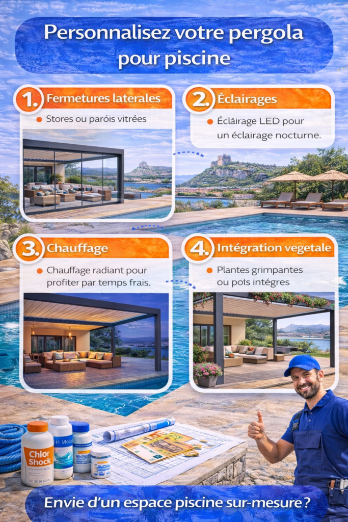 Vous pouvez ajouter plusieurs accessoires à votre pergola pour piscine. Les stores latéraux protègent du vent et des regards. Ils existent en toile ou en verre. Vous créez un cocon vraiment intime.