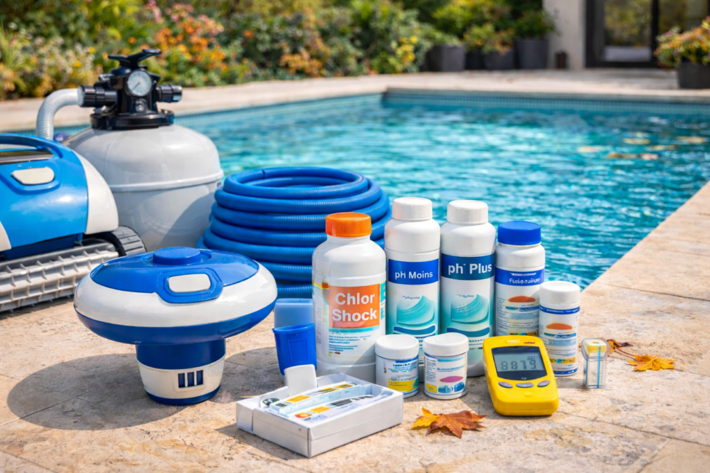 Pour ne pas vous perdre dans les rayons, retenez qu’il vous faut trois essentiels : un régulateur de pH (pH Moins ou pH Plus) car c’est la base de tout équilibre, un désinfectant (chlore, brome ou oxygène actif) pour tuer les bactéries, et un produit anti-algues en prévention. Je conseille souvent d’ajouter un floculant si vous avez un filtre à sable, pour obtenir cette finesse de filtration qui rend l’eau vraiment cristalline.